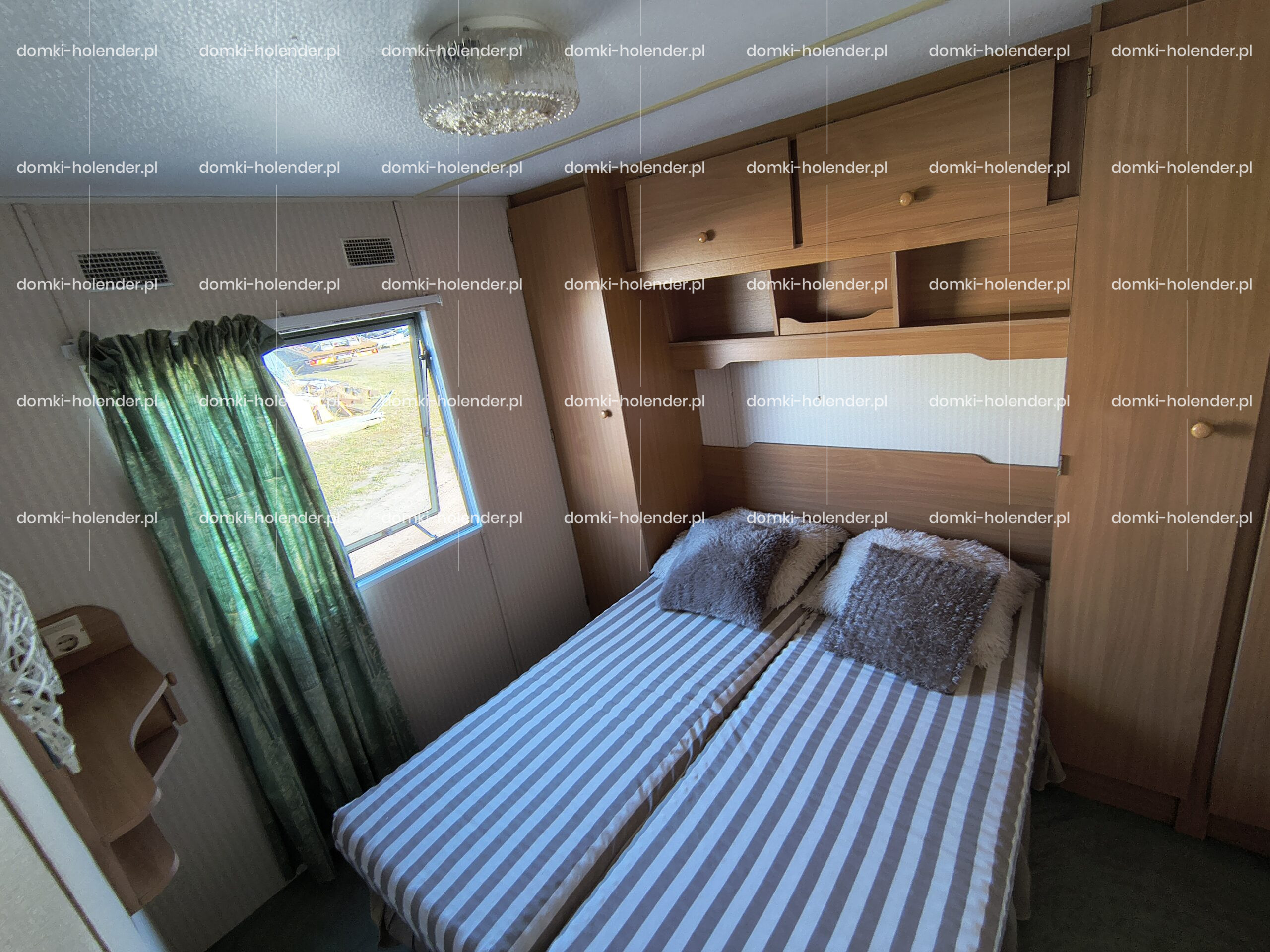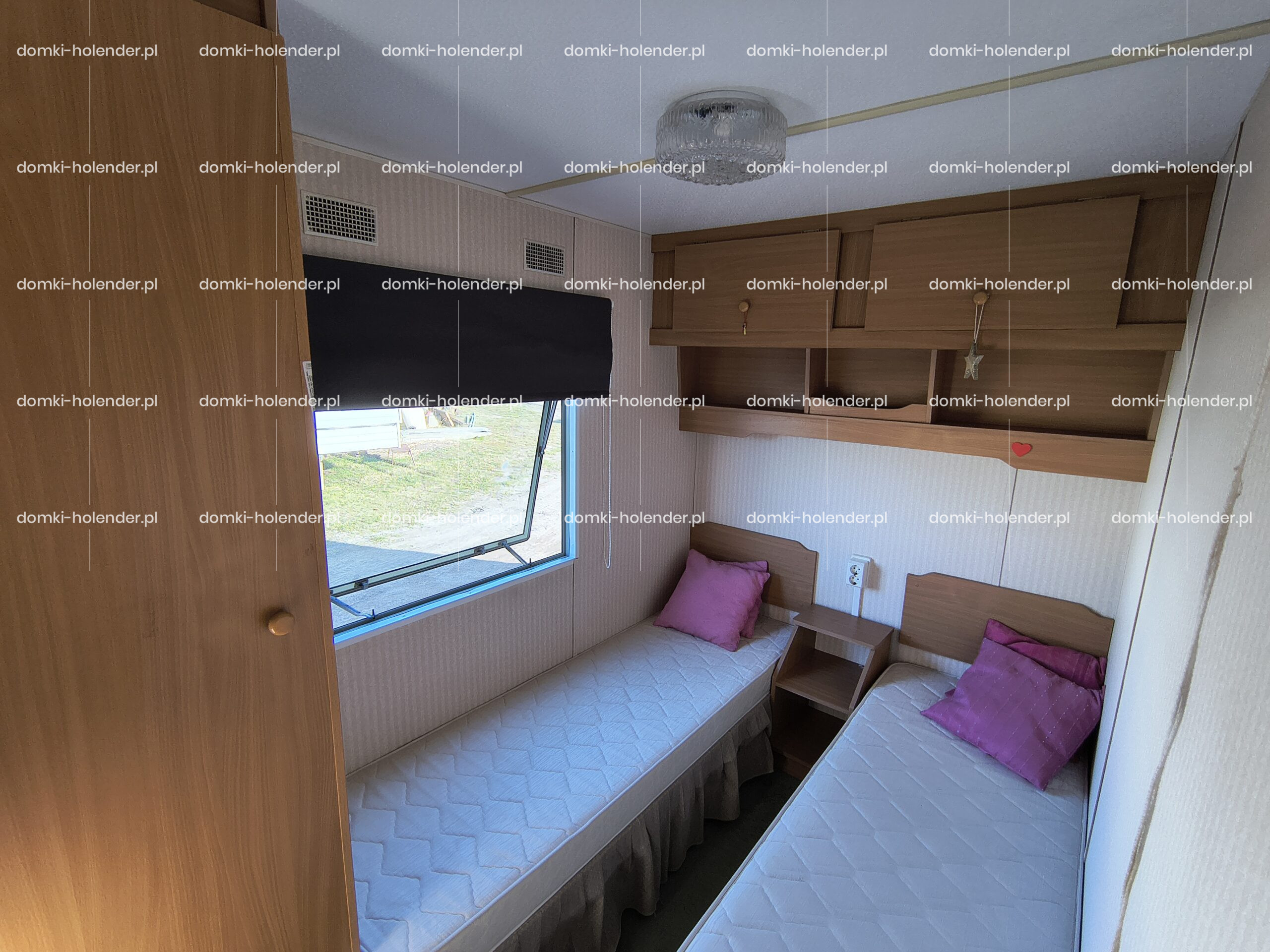 mała sypialnia z dwoma pojedynczymi łóżkami i szafą